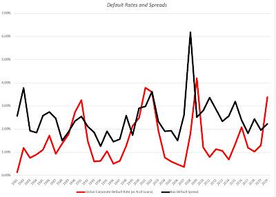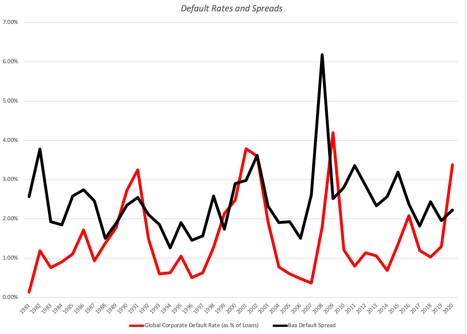 The default spreads at the end of 2020 are at the low end of the historical spectrum, and the contrast with the 2008 crisis is stark, since default spread surged in the last quarter of 2008 and did not come back down to pre-crisis levels until almost two years later. The other is to look at corporate defaults over time to see if markets are building in enough of a buffer against future defaults.