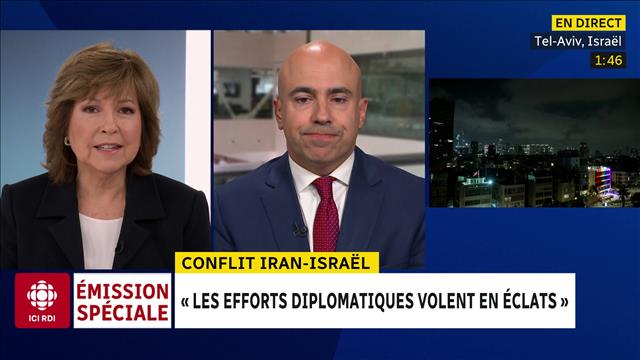 Les généraux Mohammad Bagheri (à droite) Hossein Salami (à gauche). Photo : middle east images/afp via getty / ARMIN KARAMI L’ayatollah Ali Khamaneï a procédé, dans les heures qui ont suivi l’attaque dans la nuit de jeudi à vendredi, à la nomination des remplaçants des chefs de l’armée qui ont été tués dans la première frappe contre la capitale iranienne à l’aube. De hauts gradés de l’armée iranienne et du Corps des gardiens de la révolution ainsi que des scientifiques experts du nucléaire ont été tués. Pour tout savoir sur ces hauts gradés iraniens assassinés, cliquez ici. Le guide suprême de la révolution iranienne, l'ayatollah Ali Khamenei, lors d'une rencontre à Téhéran avec des étudiants et des professeurs d'université. Photo : Reuters / WANA NEWS AGENCY Dès les premières heures du matin, le guide de la Révolution islamique, l'ayatollah Ali Khamaneï a adressé un court message à la population iranienne dans lequel il a déclaré que La télévision d’État iranienne a également diffusé une courte allocution du guide de la Révolution islamique dans laquelle il a souligné que l’Iran L'attaque israélienne était sans précédent. La riposte iranienne l'a été également. L'Iran a tiré une centaines de missiles sur Israël, dont la plupart ont été interceptés par le Dôme de fer. Une réplique aux frappes israéliennes de la veille, contre les installations nucléaires et militaires iraniennes. Le premier ministre Benyamin Nétanyahou, déterminé à empêcher Téhéran à s'équiper de l'arme nucléaire, s'est adressé directement aux Iraniens, vendredi soir, en leur parlant d'une occasion Le résumé de la journée avec Aimée Lemieux. La ministre des Affaires étrangères, Anita Anand. (Photo d'archives) Photo : La Presse canadienne / Adrian Wyld Le gouvernement canadien condamne l'attaque iranienne contre Israël après le lancement d'une salve de missiles à longue portée sur Tel-Aviv en représailles à une frappe israélienne en Iran. La ministre des Affaires étrangères, Anita Anand, a déclaré que le Canada exhortait les deux parties à la retenue. Selon elle, toute autre action pourrait avoir des Mme Anand a déclaré que les négociations entre les États-Unis et l'Iran constituaient la meilleure voie pour parvenir à une Les Canadiens présents dans la région sont encouragés à rester vigilants et à s'inscrire auprès de l'ambassade afin de recevoir des mises à jour en temps opportun. Le premier ministre Mark Carney a déclaré dans une publication sur les médias sociaux que le programme nucléaire iranien La Presse canadienne Le ministère canadien des affaires étrangères conseille à tous les Canadiens de quitter le Moyen-Orient si possible, alors que le conflit entre Israël et l'Iran s'aggrave. Dans un communiqué publié vendredi, le ministère des affaires étrangères a invité les Canadiens qui se trouvent au Moyen-Orient à Le gouvernement canadien recommande par le fait même d'éviter tout voyage en Israël, en Cisjordanie et dans la bande de Gaza ainsi que d'éviter les voyages non essentiels en Jordanie. Le ministère des affaires étrangères indique par ailleurs que son registre des Canadiens à l'étranger compte 76 785 citoyens au Moyen-Orient, dont 1 654 en Iran et 5 719 en Israël, en Cisjordanie et dans la bande de Gaza. Il ne s'agit pas d'une comptabilisation complète de tous les Canadiens, car il s'agit d'un service d'auto-enregistrement volontaire. L'Iran intensifiera ses attaques contre Israël et ciblera les bases de tout pays qui tenterait de défendre l'État hébreu, a déclaré vendredi un haut responsable iranien à CNN. Des sources américaines et israéliennes ont indiqué à CNN que l'armée américaine avait contribué à intercepter des missiles iraniens lancés contre Israël. Une source israélienne a indiqué à CNN que d'autres pays de la région avaient également soutenu la défense aérienne israélienne. Avec les informations de CNN L’armée israélienne a indiqué que l’Iran avait lancé une nouvelle attaque. Les sirènes retentissent dans plusieurs régions du territoire israélien. Avec les informations de Times of Israel et Al Jazeera L’escalade entre l’Iran et Israël s’inscrit dans une longue rivalité historique. Quel rôle jouent les États-Unis dans le conflit? Céline Galipeau en discute avec Rafael Jacob, chercheur associé à la Chaire Raoul-Dandurand et analyste en politique américaine. Une femme grièvement blessée lors de la première salve de missiles lancée par l'Iran sur Israël serait finalement décédée, selon ce que rapporte la chaîne publique Kan. Si ce décès est confirmé par les autorités, il s'agira de la première victime israélienne depuis le début des hostilités. Avec les informations d'Al Jazeera L'Iran a accusé, devant le Conseil de sécurité des Nations unies, les États-Unis d'être complices des attaques menées vendredi par Israël, ce que Washington a démenti, disant à Téhéran qu'il serait L'ambassadeur d'Israël auprès des Nations unies, Danny Danon, a déclaré que l'Iran s'était Son homologue iranien, Amir Saeïd Iravani, a accusé Israël de chercher à Danny Danon a déclaré qu'Israël avait fait preuve de patience malgré les risques croissants. Avec les informations de ReutersQui sont les chefs et officiers assassinés par Israël?